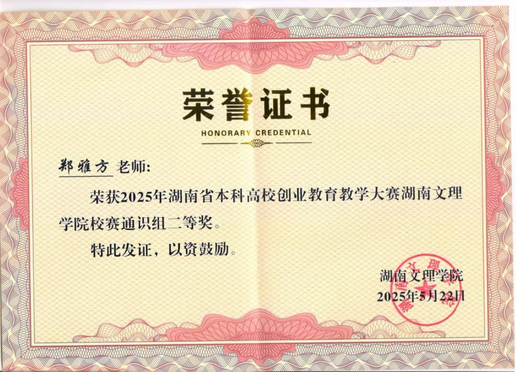 2025年5月15日晚,湖南文理学院“2025全省本科高校创业教育教学比赛校赛暨湖南省高校创业教育教学比赛选拔赛”圆满落幕。经过激烈角逐,机械工程学院郑雅方老师凭借课程《不确定性时代与人生创造的两种思维》荣获通识课程组二等奖,展现了我院教师在创新创业教育领域的扎实功底和教学创新实力。