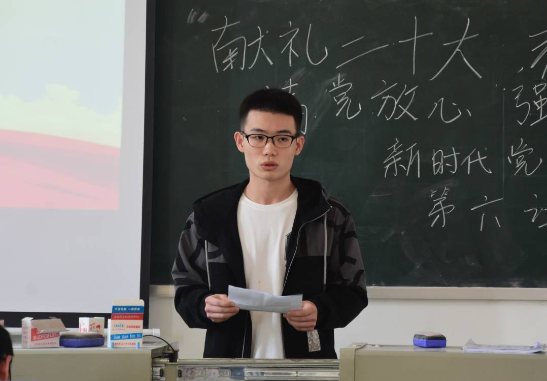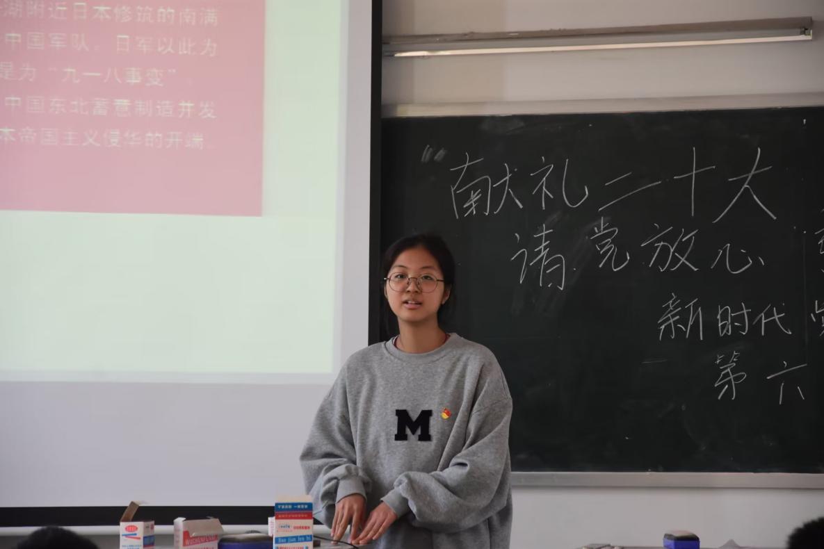 学生党员陈缘以“砥砺前行初心,信仰奋斗终生”为主题结合了众多英雄先烈的事迹从“不畏浮云遮望眼,自缘身在最高层”“人不率则不从,身不先则不信”“千淘万漉虽辛苦,吹尽狂沙始到金”三个方面展开宣讲,她说道,不忘初心,方得始终,回望源头,汲取信仰力量,面向未来,更是肩上重任。