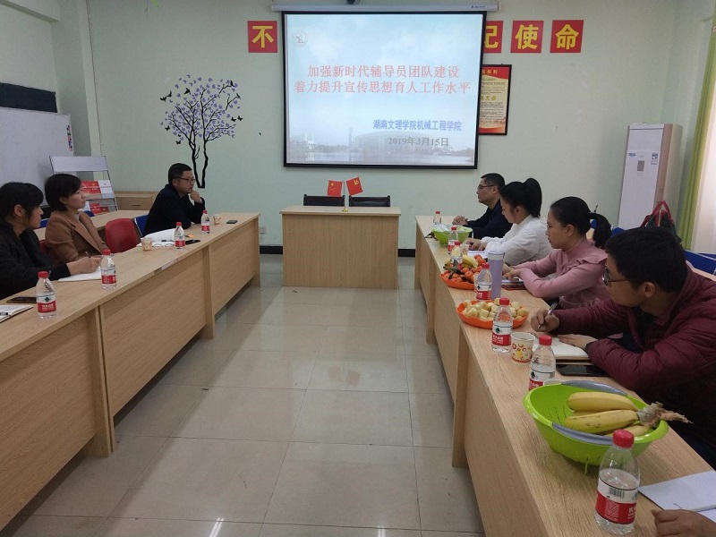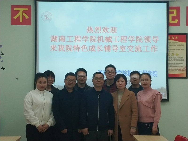 本网讯(新媒体供稿)2019年3月15日下午,湖南工程学院机械工程学院党总支副书记李儒峰老师一行6人来我院交流指导学生思想政治教育工作,两院老师主要围绕着“辅导员团队建设”、“宣传思想育人”、“特色成长辅导室建设”、“学生学科竞赛”等方面开展讨论、研究和分享。本次交流指导会在机械楼427会议室隆重举行,我院班子成员及全体辅导员参加了交流会。