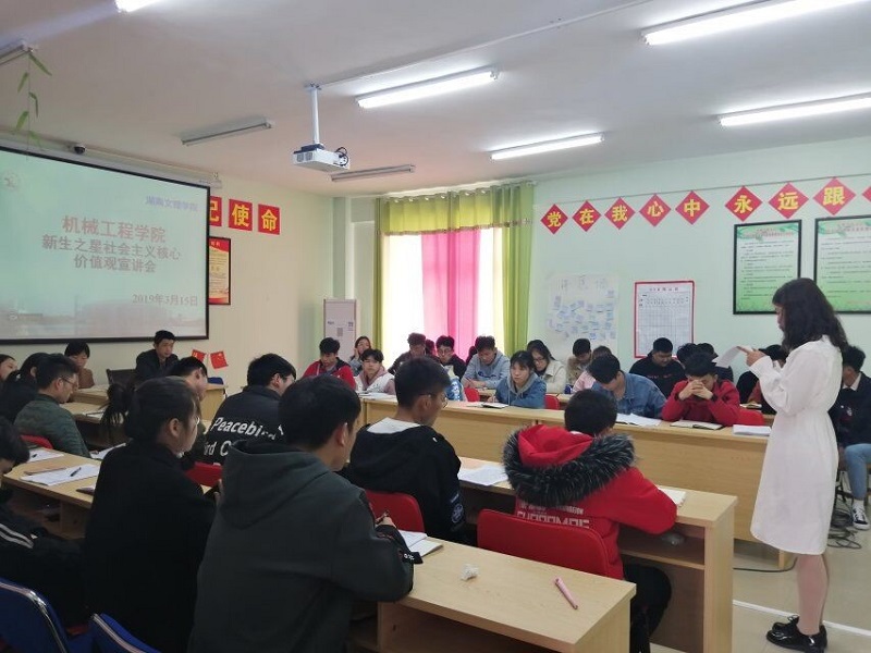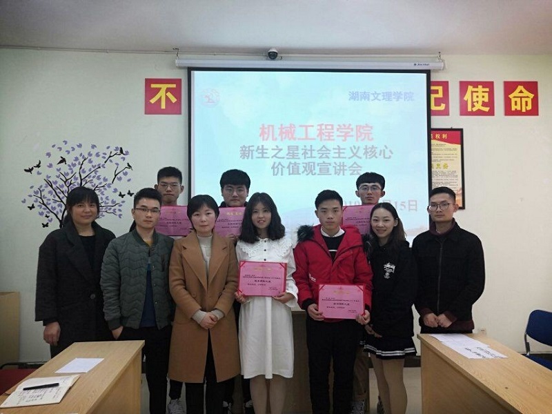 本网讯(通讯员:张译尹)为全面加强学生思想建设,积极引导学生努力学习先进思想理论知识,不断提高自身思想政治素质,进一步培育和践行社会主义核心价值观,树立和宣传大学生中的先进典型,展示新时代大学生的精神风貌,2019年3月15日中午,机械工程学院新生之星“社会主义核心价值关”宣讲会在机械楼B427顺利召开。出席本次会议的领导老师有机械工程学院党总支副书记刘双老师、学工办辅导员张群英老师、廖宇环老师、彭亮老师。机械工程学院各班学生干部、学生代表及2018级新生之星参加了本次会议,本次宣讲会由学院学习科研部部长张鑫婕同学主持。