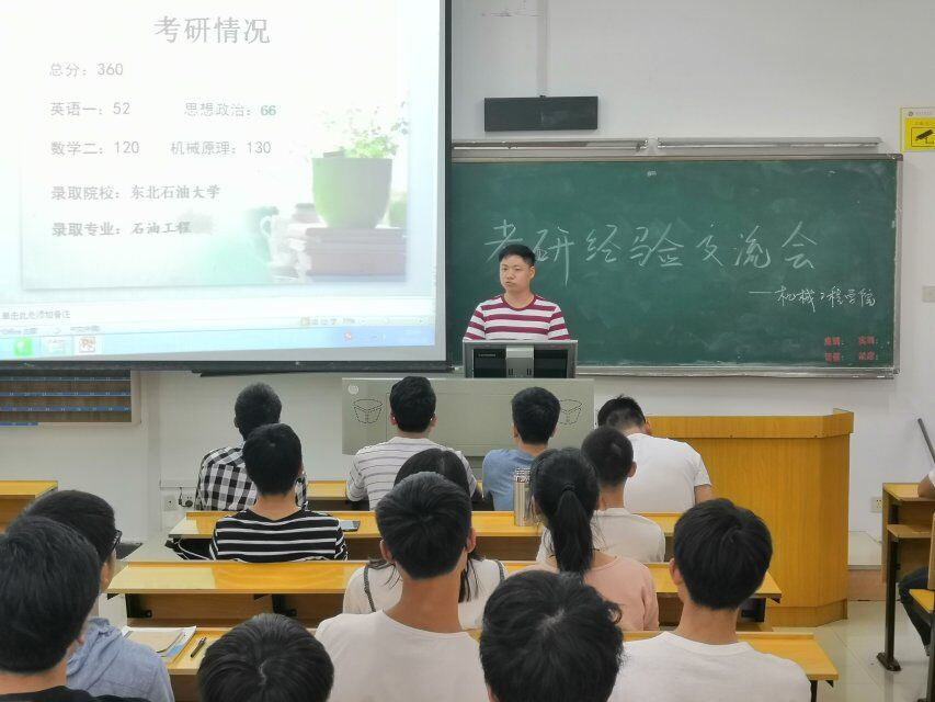 首先,机自15103班黄俊同学在分享他自己考研经验时建议在大一、大二期间多去参加大学生学科专业竞赛,比如机械创新设计大赛、工程训练大赛、机器人大赛等,争取获得省级及以上奖励,为考研复试加分。接着,机自15104班欧谊、机自15102班周淑伟、机电15101班龙杜辉、机电15102班张杰、机自15104班罗彪、机电15102班黄浩六位同学在考研具体科目上总结了他们的学习方法:一、数学要打好基础,多做题,提高计算能力;二、英语要多背单词,多背范文,多看、多分析、多总结历年真题;三、政治要善于提炼总结,关注时事政治,把握大的方向,多记多背;四、在专业科目上,一定要注重平时的积累与反思,不懂的及时询问老师或同学,要勤于学、勤于思考、勤于实践、勤于总结。总之,在考研路途中,切记要明确考研目标、选择合适的考研资料、专心复习,稳扎稳打,也要学会适度自我放松,自我调节。