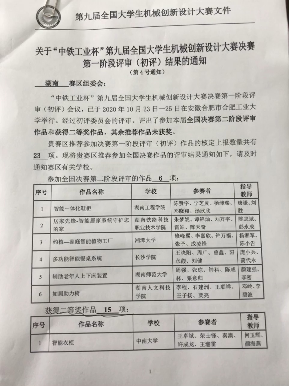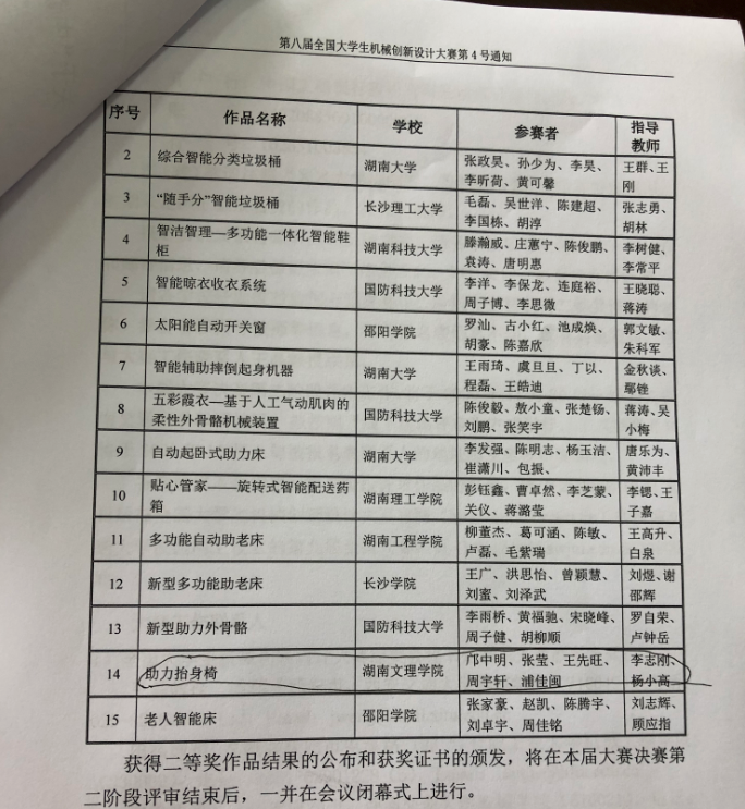 “中铁工业杯”第九届全国大学生机械创新大赛决赛第一阶段评审(初评)会议,已于2020年23日—25日在安徽合肥市合肥工业大学举行。经过初评委员会的评审,我院李志刚老师和杨小高老师指导的作品《助力抬身椅》获得第九届全国大学生机械创新设计大赛决赛二等奖。