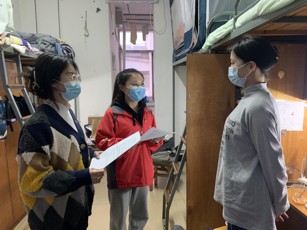 学生支部负责人带领学生党员进寝室宣传防疫知识、了解学生需求、帮助解决实际困难,及时反馈情况,以实际行动践行初心使命;在“佩戴口罩、文明劝导”志愿活动中,学生党员不时提醒在校学生做好防护,展现了学生党员的先锋模范作用;开展“三联”志愿服务活动,做好联系学生、联系寝室、联系班级工作,提醒做好个人防护,自觉落实疫情防控措施。同时关注疫情期间所帮扶学生的心理和健康状态,引导学生正确看待疫情形势、严格遵守防疫要求,切实做好学生的心理辅导。除此之外,志愿者们还参与了校门口值班、测温查码等工作。