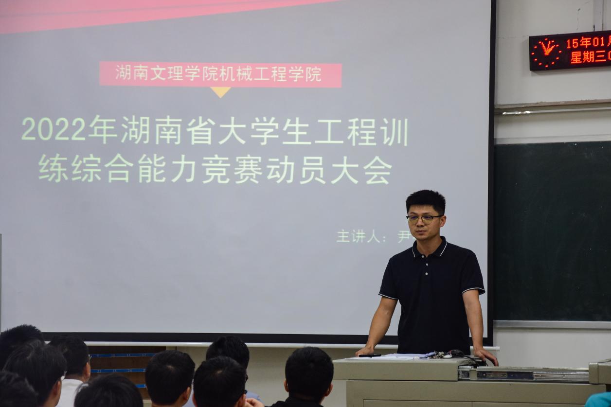 动员会上,尹亮向同学们介绍了在往届大学生工程训练综合能力中我院取得的成绩,并就2022年湖南省大学生工程训练综合能力竞赛动员进行详细解读,如参赛方式及奖项设置等。尹亮强调,本届大赛以“双碳”、“红色”、“系统”、“动手”为命题主旨,旨在践行绿色低碳、重温长征故事,鼓励同学们积极参赛、认真备赛,以赛促学、以赛促教、以赛促改、以赛促建,展现出我院学子的动手能力。
