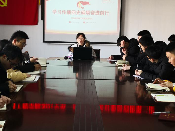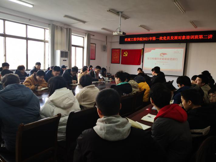12月30日中午12点30,机械工程学院学生党支部在机械楼B401开展了2021年第一批党员发展对象培训班主题培训——学习传播四史砥砺奋进前行。学生党支部全体党员和入党发展对象参加了本次培训,主讲人是党总支副书记刘双老师。