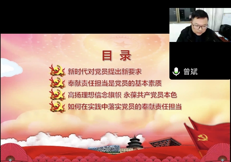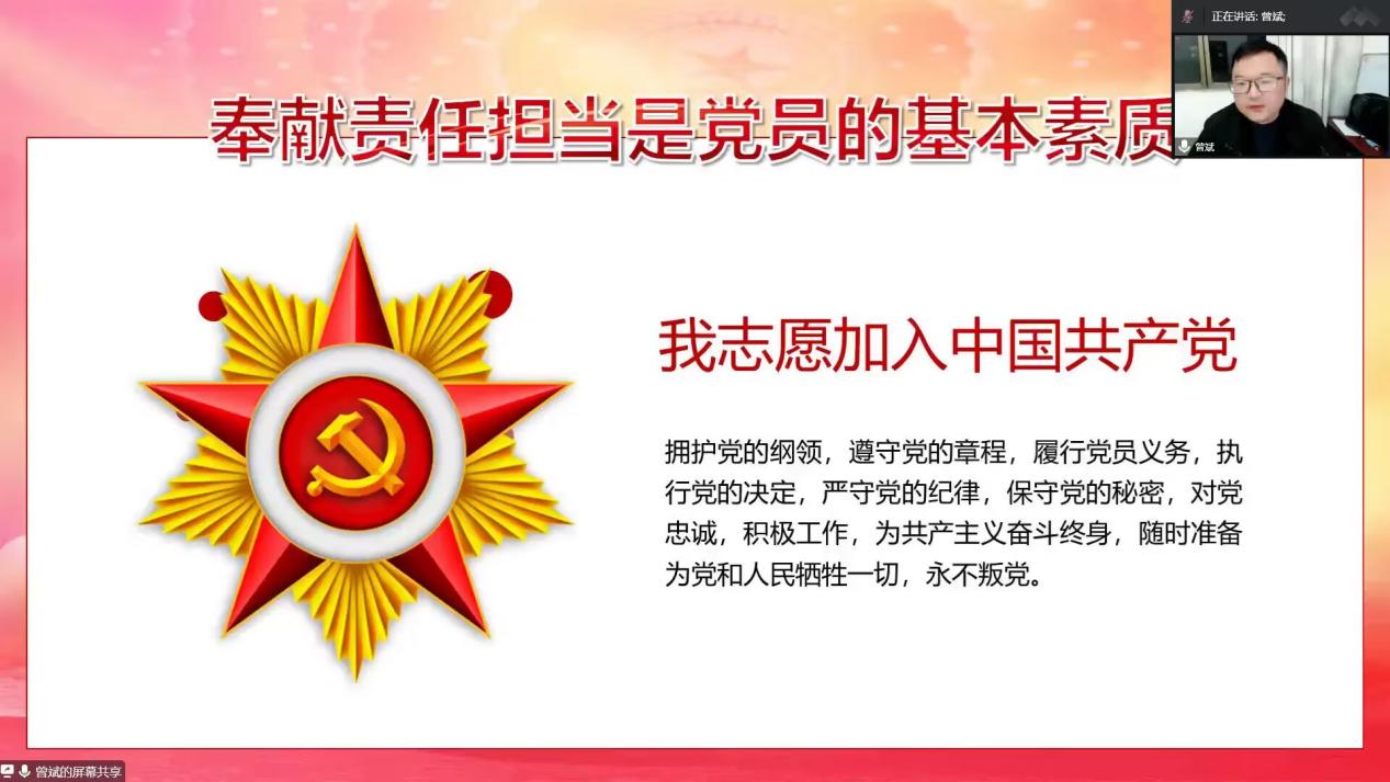2022年12月7日19:00,机械工程学院院长曾斌教授以“弘扬奉献精神 做合格共产党员”为主题进行专题党课。本次党课以线上方式进行,2022年发展对象及支部全体党员参加。学院学生党支部书记邹洁主持。