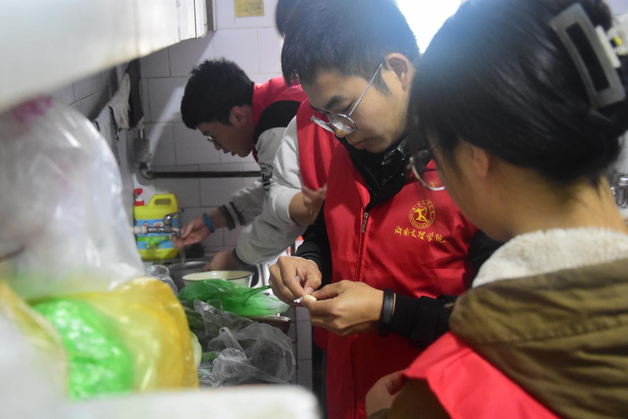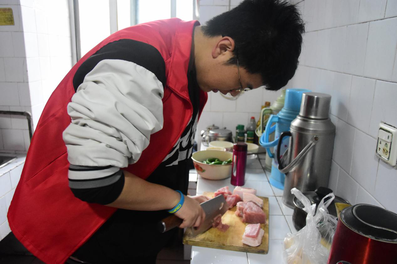 3月19日,我院志愿者们一早买好的新鲜食材和礼物,一同前往百街口社区老人家中。志愿者和冯爷爷唠唠家常,关切老人的身体状况,倾听他讲述年轻时的人生历程,给予心灵上的慰藉。大家有条不紊地忙着切菜、洗菜等准备工作。几名小志愿者是公认的大厨,只见忙碌的身影在厨房里干净利落地准备着。一小时后,一桌色香味俱全的暖心“午餐”便呈现在饭桌上了。看着热腾腾的饭菜,冯爷爷感动地说:谢谢你们,饭菜好香啊,真是辛苦你们了!