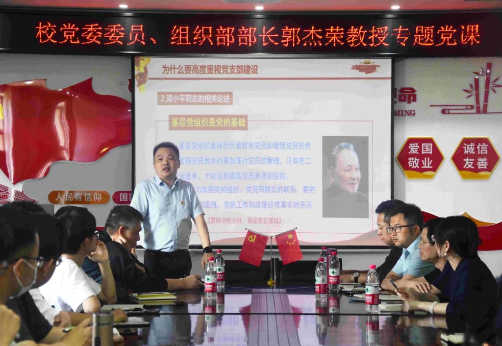 5月24日下午,学校党委委员、组织部部长郭杰荣在机械工程学院E4-B401讲授主题教育专题党课。信息与现代教育技术中心、保卫部主要负责人,机械工程学院和医学院党政班子成员、党员教师代表,机械学工程院学生预备党员和入党积极分子聆听党课。党课由机械工程学院党委副书记(主持党务工作)李叶林主持。