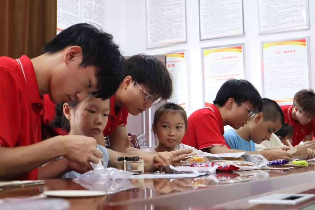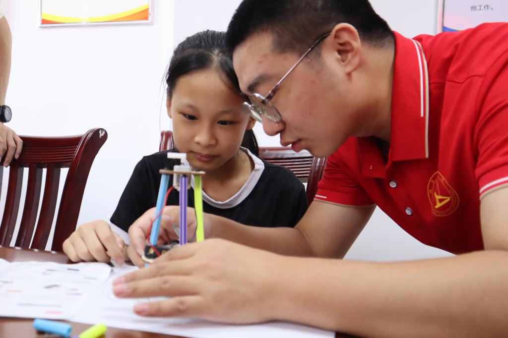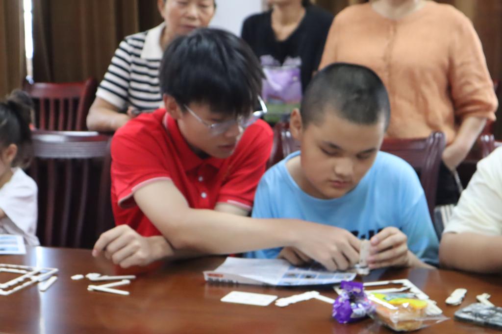 科技体验不止于“看”。实践团特意带来了多套智能机器人积木组件,免费发放给到场的留守儿童。在志愿者的耐心指导和帮助下,孩子们化身“小小工程师”,认真识别零件,专注组装连接。从最初的茫然到渐渐上手,从遇到困难时的眉头紧锁到完成作品后的欢呼雀跃,积木块在孩子们灵巧的小手中逐渐成型为“智能机器人”。搭建的过程不仅是科技知识的实际运用,更是志愿者们与孩子们建立信任、心灵沟通的温暖桥梁。