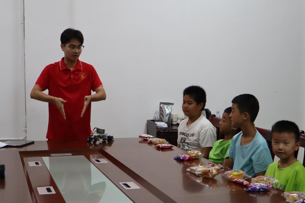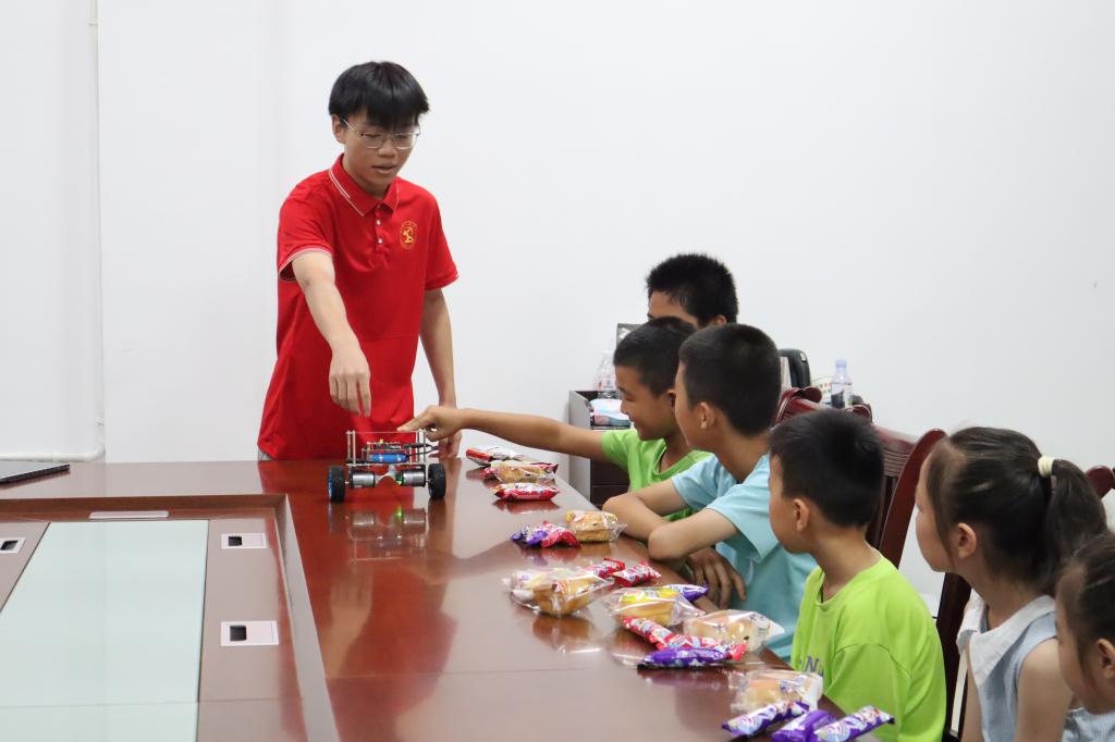 我院学子发挥专业优势,为孩子们精心打造了“机械科普嘉年华”活动。活动现场,形态各异的小车牢牢抓住了孩子们的目光:智能循迹小车沿着画在地面的黑线精准前行;看似“站不稳”的两轮平衡小车通过内部精妙的传感器和控制系统稳立不倒;力遥控小车更是让孩子们惊喜不已,只需通过手势倾斜一个控制器,小车便能感知前行、后退或转向。实践团成员深入浅出地讲解着传感器、平衡控制、重力感应等原理,揭开了科技产品的“神秘面纱”。课后,一名四年级的孩子满怀憧憬地对志愿者说:“哥哥,以后我也要学机械,做个自己的智能机器人!”