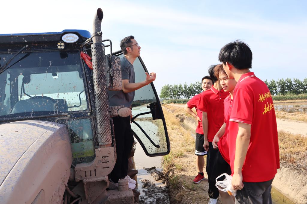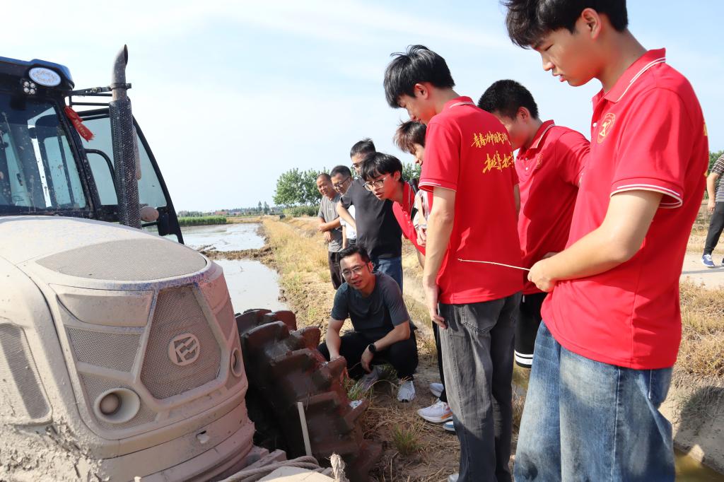 在村干部的协作下,实践团将课堂移至耕作现场。一台正在作业的多功能犁田机成为了教学实践平台。指导老师徐戎副教授和坤鼎数控时元强工程师在此为种粮大户传授农机维护和保养知识。徐戎详解动力传动系统、齿轮箱动力路径及犁刀原理,强调犁刀轴承周保养和机油清洁的重要性;时元强则讲解常见故障识别与排查,指导观察液压渗漏、传动异响等隐患。在场的种粮大户就实际耕作中的磨损、故障、调校等疑难问题向老师请教。