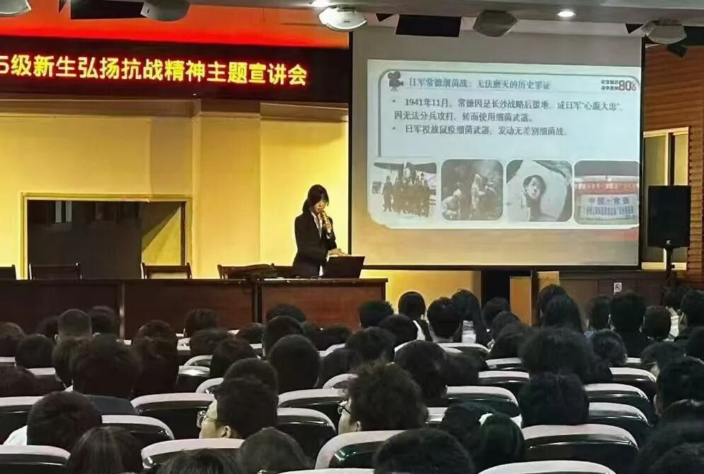 宣讲团成员田可以纪念中国人民抗日战争暨世界反法西斯战争胜利80周年为切入点,通过详实的史料、震撼的案例,带领新生重温了山河破碎的苦难岁月、中华民族不屈不挠的抗争历程以及英雄儿女可歌可泣的奉献故事。从九一八事变到七七事变,从南京大屠杀到常德细菌战,从邓铁梅、杨靖宇等革命先烈到上海四行仓库"八百壮士""狼牙山五勇士"等英雄群体,一个个鲜活的故事让在场新生深刻体会到伟大抗战精神的丰富内涵。