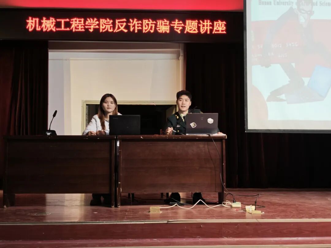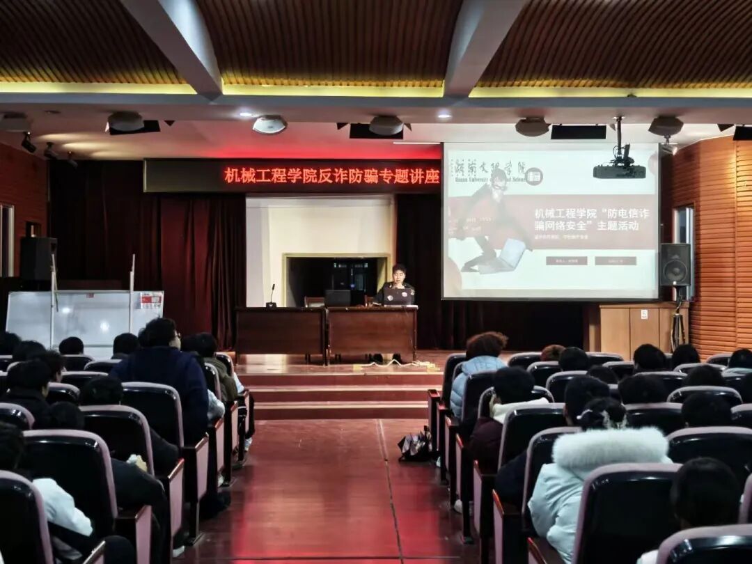 本网讯:为进一步增强学生的安全防范意识,提升识诈、防诈、反诈能力,筑牢校园安全防线,3月16日晚7点,湖南文理学院机械工程学院在东校区第一实验楼会议厅举办了反诈防骗专题讲座。活动邀请退役军人、机电23103班肖弯弯同学担任主讲,2025级全体学生到场参加。讲座由2025级辅导员艾丹枫老师主持。