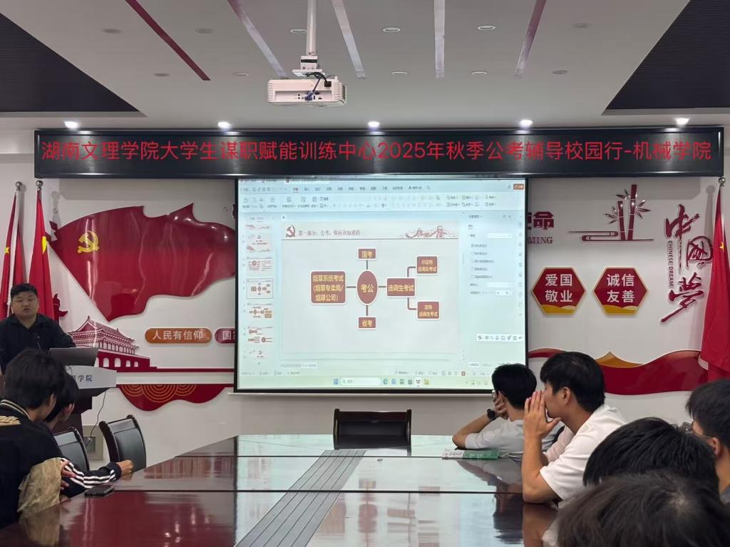 本网讯:为精准服务学生就业需求,提升学生在公务员及事业单位招录考试中的核心竞争力,湖南文理学院大学生谋职赋能训练中心于9月25日在机械楼B401成功举行了“公考辅导校园行”活动。此次分享会邀请胡文玮老师担任主讲,我院大四学生踊跃参与。