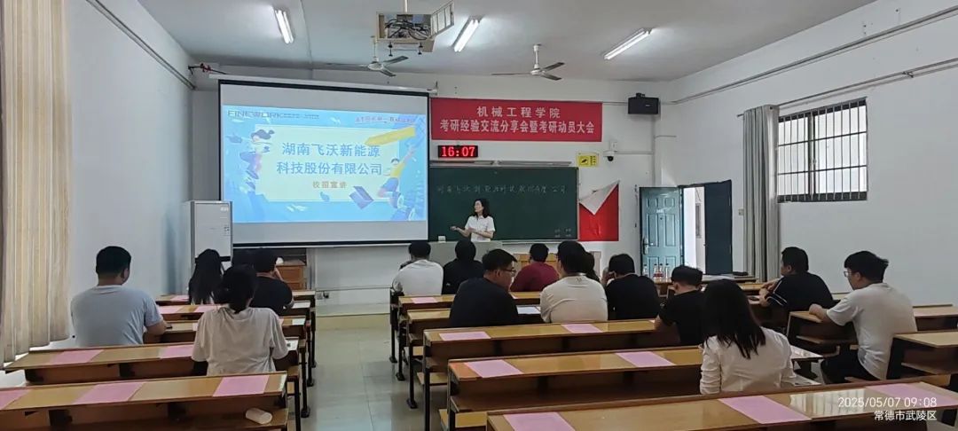5月7日,湖南飞沃新能源科技股份有限公司(以下简称“飞沃科技”)来我院宣讲暨专场招聘会。飞沃科技校园宣讲会在我院机械楼B611教室顺利举行,吸引了我院众多2025届毕业生参加。