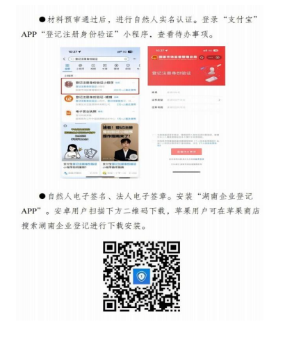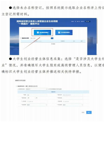 一、办事方式 (一)线上全程电子化方式。通过“湖南省企业登记全程电子化 业务系统”办理申请(https://hnscjgjamr.hunan.gov.cn/)。 1.基本信息采集。按照电子化系统业务提示,逐项填写企业名 称、住所、经营范围、股东、创业大学生等基础信息。(详细说明 见“全程网办流程操作指引”) 2.提交证明材料。对照系统生成的材料提交清单,逐项生成申 请书、章程等规范文书,并上传住所证明、人员身份证、股东证明 等证明材料。材料上传后,提交登记机关预审材料。 3.电子签名签章。自然人签名:登录“支付宝”APP“登记注 册身份验证”小程序,完成自然人身份认证,再登录“湖南企业登 记”APP,完成自然人电子签名。企业法人签章:登录“微信”或 “支付宝”APP“电子营业执照”小程序,申领法人电子营业执 照,再登录“湖南企业登记”APP,授权电子签章。 4.登记机关审批。电子签章完成后,通过“湖南省企业登记全 程电子化业务系统”正式提交业务申请。登记机关收到申请后,完 成业务审核,并出具审核结果。(二)窗口现场办理方式。申请人携申请资料前往所属区县(市) 登记机关企业登记服务专窗办理。全省各级登记机关办事地址和咨— 2 —询电话可通过以下网站查询:https://hnscjgj.amrhunan.gov.cn /g/lxfs经营主体类型选择比较 维度 有限公司 合伙企业 个人独资企业 个体工商户 法律设 定依据《中华人民共和国公司法》 《中华人民共和国合伙企业法》 《中华人民共和国个人独资 企业法》 《促进个体工商户发展条例》、 《个体工商户登记管理办法》特点与 优势1.有限责任:股东以其认缴的出 资额为限对公司承担责任(核心 优势)。 2.所有权与经营权分离,治理结 构规范(股东会、董事会/执行董 事、监事会/监事)。 3.融资能力强(可增资扩股、吸 引外部投资、申请贷款信誉度相 对较高)。 4.股权可转让,易于延续和发展。 5.社会认可度高,利于品牌建设 和大规模经营。 6.可多人合作投资。 1.设立相对简便,管理灵活(协 议约定优先)。 2.税收穿透:合伙企业本身不 缴纳企业所得税,合伙人缴纳个 人所得税(避免双重征税)。 3.整合资源与专业能力。 4.部分行业(如律所、会计师 事务所)法定组织形式。 5.普通合伙人可劳务出资。 6.融资渠道比个人独资/个体户 灵活。 1.设立程序最简单、成本最 低。 2.税收穿透:企业不缴纳企 业所得税,投资人缴纳经营 所得个人所得税。 3.决策效率高:投资人个人 完全控制经营。 4.财务核算要求相对较低。 5.适合小规模、个人主导的 经营模式。 1.设立门槛最低、手续最简便、 成本最小。 2.经营灵活:规模小、转向快。 3.税收优惠多:通常可核定征 收,税负可能较低;享有较多 针对小微和个体的优惠政策。 4.对经营场所要求相对灵活 (可家庭经营)。 5.适合小本经营、个人或家庭 经营、社区服务等。缺点与 风险1.管理结构复杂:需设立章程、 建立治理机构、遵守公司法规定。 2.存在双重征税风险:公司缴纳 企业所得税,股东分红再缴个人 所得税。 3.决策流程可能较慢(需按章程 和公司法程序)。 1.无限连带责任(核心风险): 普通合伙人对合伙企业债务承 担无限连带责任;有限合伙人以 出资额为限承担有限责任。 3.融资能力弱于有限公司(股 权流动性差)。 4.管理权分散可能影响决策效 率。 1.无限责任(核心风险): 投资人对企业债务承担无限 责任,个人财产与企业财产 无严格区分。 2.融资能力弱:难以吸引外 部股权投资,贷款主要依赖 个人信用。 3.发展受限:难以规模化、 股权不可分、难以引入专业 管理团队。 1.无限责任(核心风险):经营 者对债务承担无限责任,个人 /家庭财产与经营财产无严格 区分。 2.主体资格弱:通常不被视为 严格法律意义上的“企业”, 合同签署、招投标、融资等受 限。 3.难以做大做强:规模小、品 牌化难、吸引投资难、贷款额 度有限。— 4 —比较 维度 有限公司 合伙企业 个人独资企业 个体工商户 主要申 请材料1.公司登记(备案)申请书 2.公司章程 3.股东/发起人资格证明或身份证 明 4.法定代表人、董事、监事、经 理任职文件及身份证明 5.住所(经营场所)证明 6.法律行政法规规定需审批的批 准文件(如涉及前置许可) 1.合伙企业登记(备案)申请 书 2.全体合伙人签署的合伙协议 3.合伙人主体资格证明或身份 证明 4.住所(经营场所)证明 5.法律行政法规规定需审批的 批准文件(如涉及前置许可) 1.个人独资企业登记(备案) 申请书 2.投资人身份证明 3.住所(经营场所)证明 4.法律行政法规规定需审批 的批准文件(如涉及前置许 可) 1.个体工商户登记(备案)申 请书 2.经营者身份证明 3.住所(经营场所)证明 4.法律行政法规规定需审批的 批准文件(如涉及前置许可)适用人 群建议有较大规模经营计划、需融资、 需风险隔离(有限责任)、多人 合作投资、希望建立规范企业形 象、计划长期发展的创业者。 专业服务机构(如律所、会计师 事务所、咨询公司)、志同道合 且信任度高的朋友/专业人士合 作创业、希望避免企业所得税且 能接受协议治理模式的经营者。 特别注意普通合伙人的无限责 任风险。 个人小本创业、经营风险相 对可控、追求完全自主决策、 规模小且不计划引入外部投 资或大规模扩张的经营者。 特别注意无限责任风险。 小本经营、家庭经营、流动性 经营(如小摊贩)、社区服务、 初期