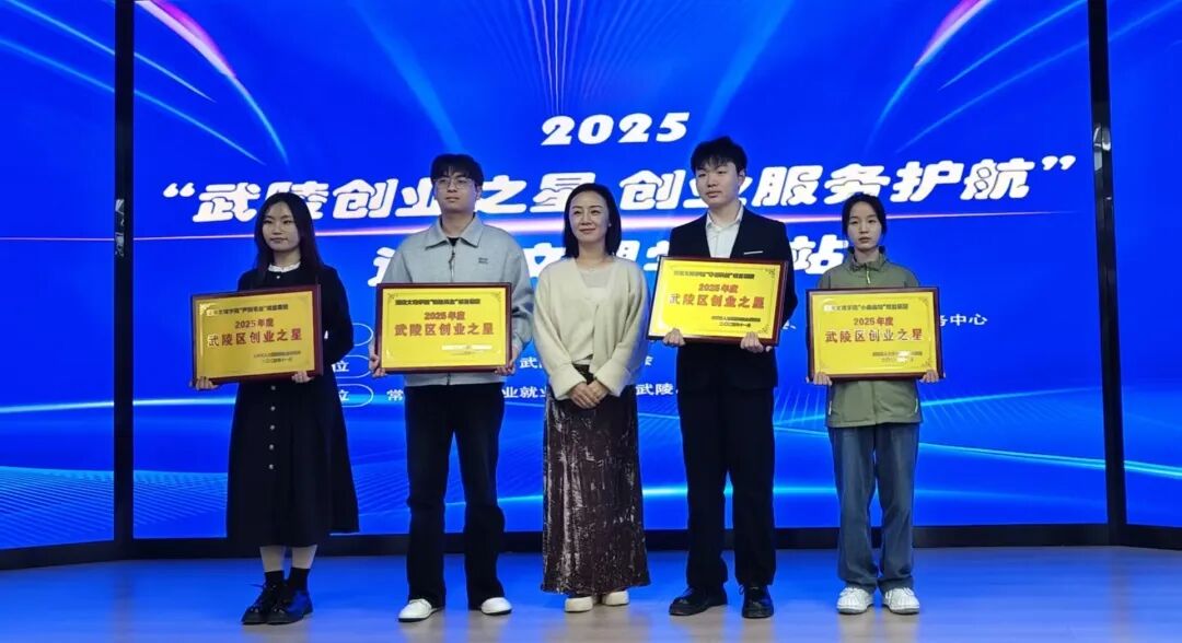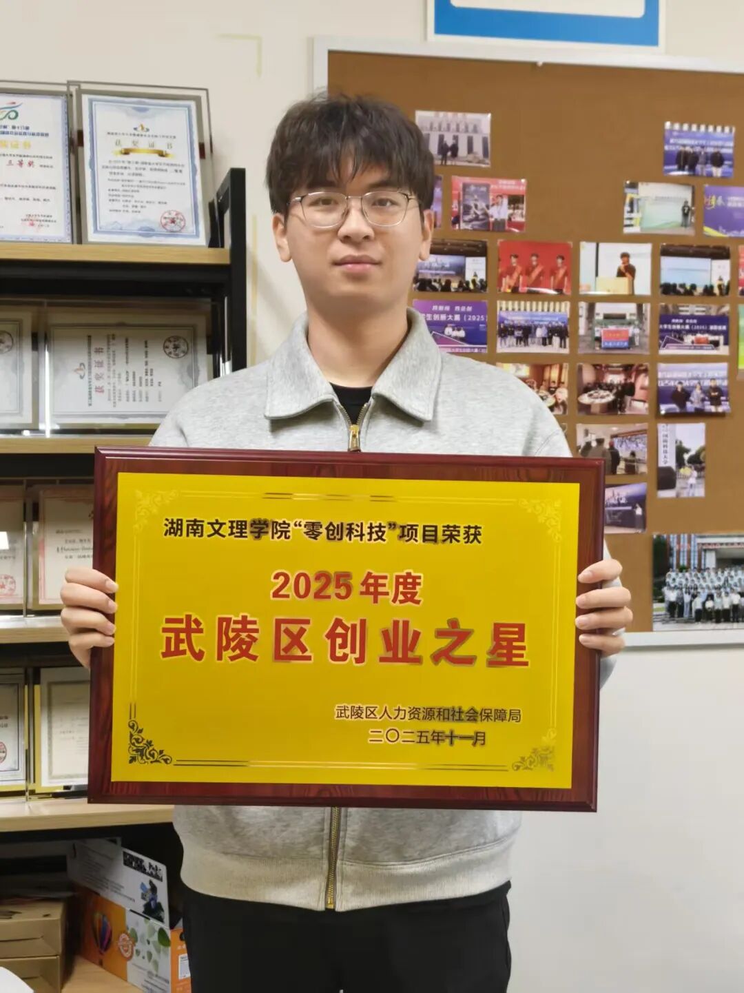 本网讯:11月4日下午,我院机自23103班李文浩同学受邀参加武陵区人力资源和社会保障局联合湖南文理学院举办的“武陵创业之星”评选活动及创业服务护航行动。会上,他分享创业项目,并作为常德零创科技有限公司负责人荣获2025年度“武陵区创业之星”。